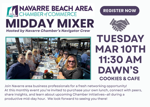 Name: Navarre Chamber Mid-Day Mixer Networking LunchDate: March 10, 2026Time: 11:30 AM - 11:30 AM CDTRegistration: Register Now