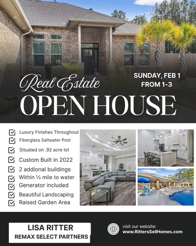 Event Description:Check out this gorgeous estate at 5923 Michael Dr, Milton Fl today from 1-3. It is a stunning custom home built in 2022 with a guest house, 2 separate outbuildings, and a fiberglass saltwater pool on .92 acres and within 1/2 mile to water. It just hit the market and is being offered at 950,000.